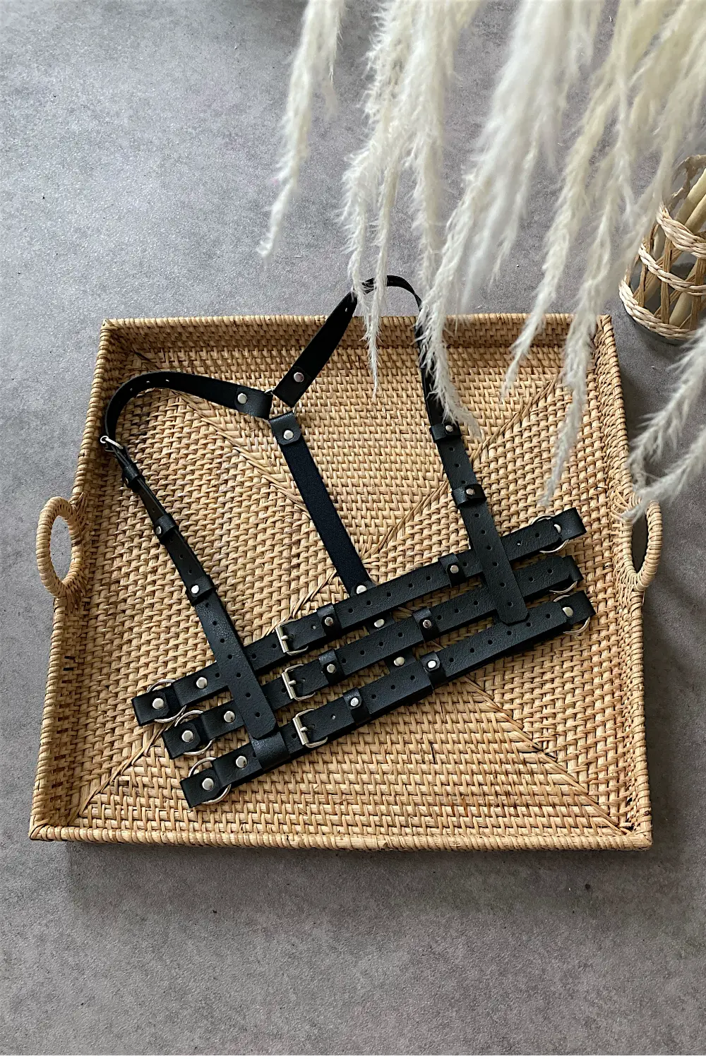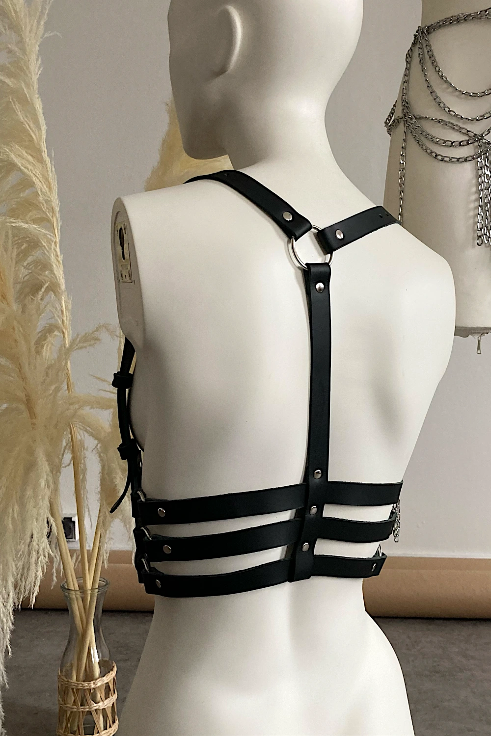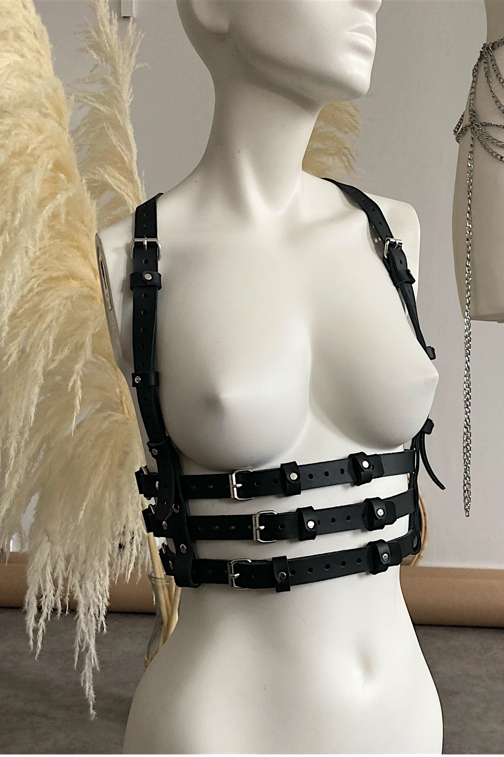 Skórzana uprząż z trzema paskami w talii. Wszystkie paski mają regulowaną wysokość i obwód.